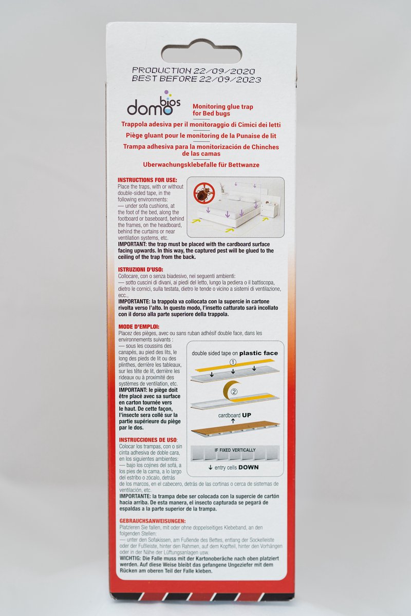 IMPORTANT: le piège doit être placé avec la surface imprimée (texte domobios) vers le haut. De cette façon, les ravageurs piégés seront collés au plafond du piège par leur dos.